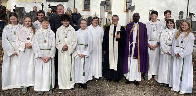 22.10.2025 Pfarrgemeinderat Volkstrauertag am 16. November / Gedenken am Kriegerdenkmal Am Foto Bürgermeister Dr. Dietmar Gruchmann, GRin Marlene Goldbrunner, Pfarrerin Kathrin Frowein und Pfarrer Barthlomew Aondo zusammen mit Ministranten. ![]() Veranstaltung Denk-mal / "Christen in der DDR" am 9. November im Pfarrsaal St. Severin Mit der Ärztin Dr. Beatrix Stosch aus Garching und Dekan Ulrich Kampe aus Oberschleißheim. Beide berichteten vom Leben als Christen in der DDR. Die Moderation machte Nicola Gerhardt. ![]() ![]() Aufnahme neue Ministrantinnen und Ministranten am 26. Oktober Durch die feierliche Aufnahme von 16 neuen Minis hat sich die Mini-Schar auf weit über 40 erhöht. Die langjährige Oberministrantin Hannah Koch (Foto mit Blumen) wurde im Gottesdienst verabschiedet. ![]() ![]() ![]() Treffen der Ehrenamtlichen am 9. Oktober Die Pfarrei dankte allen Ehrenamtlichen bei einem Gottesdienst mit anschl. kleinem Essen im Pfarrsaal. ![]() ![]() Erntedank-Gottesdienste am 4. und 5. Oktober Beim Familiengottesdienst am 5. Oktober war die Kirche St. Severin sehr gut besucht, mit vielen Familien und Kindern. Der Heimatverein hatte den Gottesdienst mitgestaltet, es sangen die Westacher Sänger. Anschließend gab es am Kirchplatz einen "Ernteschmaus" des Kindergartens St. Severin. ![]() ![]() ![]() Firmung am Sonntag 28. September Am Sonntag 28. September erhielten 44 Jugendliche der Pfarrei das Sakrament der Firmung. Am Gruppenbild auch Pfarrer Barthlomew Aondo, Domkapitular Wolfgang Huber und GRin Marlene Goldbrunner. ![]() Ministranten-Wochenende in Marktschellenberg 19.-21. September Pfarrer Barti und GRin Goldbrunner kamen am Samstag auch zu den Ministranten. ![]() Jahreskrippe in St. Severin